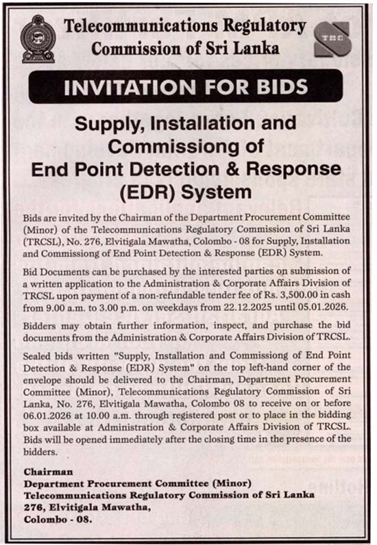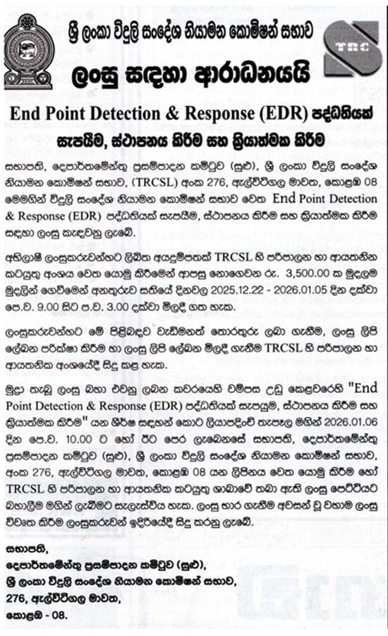| License Renewal of SentinelOne Endpoint Detection & Response system | Sinhala / Tamil / English | 2024.12.03 at 2.00 p.m. | |