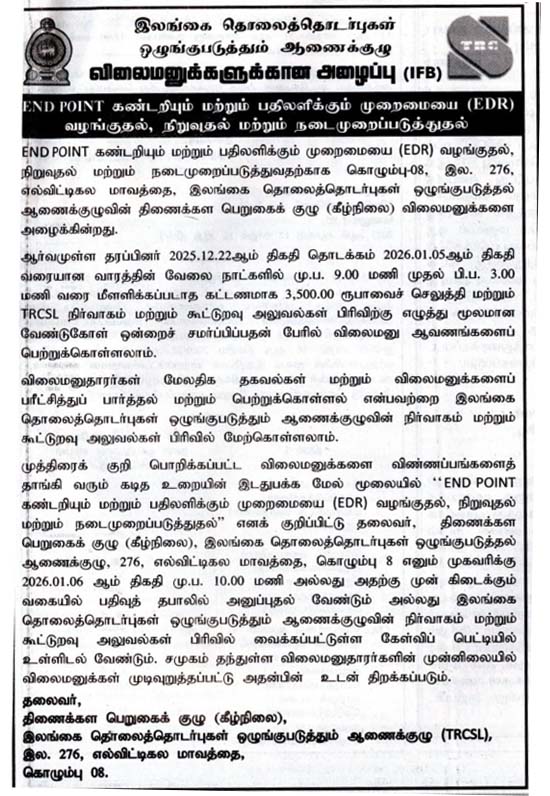 | END POINT கண்டறியும் மற்றும் பதிலளிக்கும் முறைமையை (EDR) வழங்குதல், நிறுவுதுல் மற்றும் நடைமுறைப்படுத்துதல் | Sinhala / Tamil / English | 06.01.2025 | |
