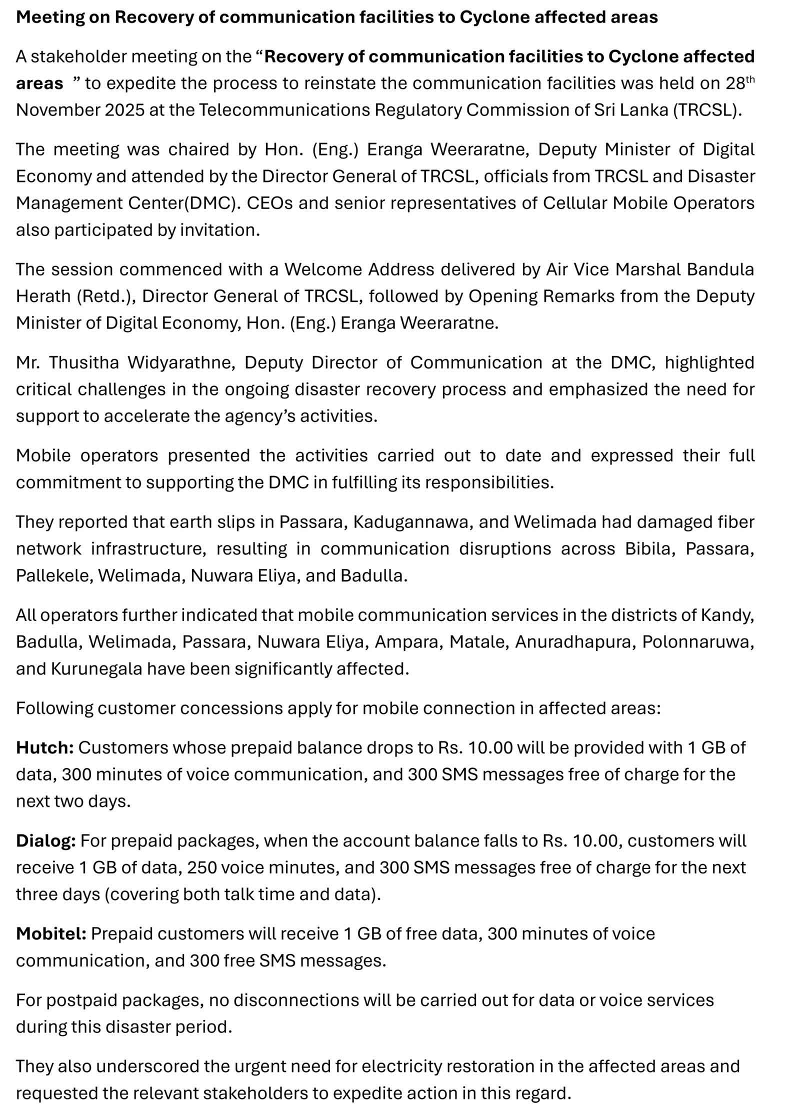 සුළි කුණාටුව හේතුවෙන් හානියට පත් ප්රදේශවල සන්නිවේදන පහසුකම් යථා තත්ත්වයට පත් කිරීම පිළිබඳ රැස්වීම