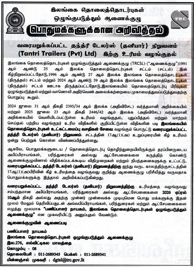 Issuance of the Licence of Tantri Trailers (pvt) ltd.